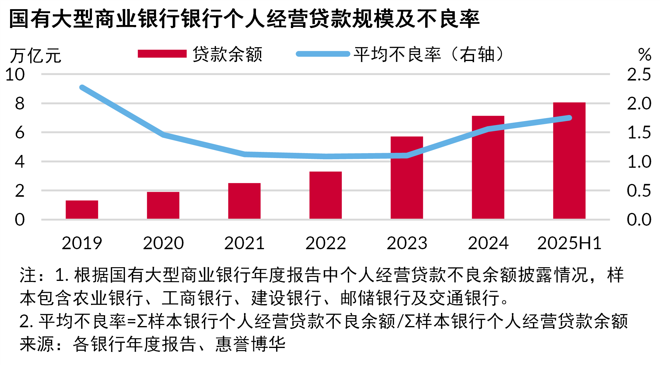 金融政策在大力扶持小微企业的同时,势必伴随一定程度客户群体信用质量的结构性下沉,长尾客户及特定行业小微企业抗风险能力相对薄弱,生存压力较大。因此,小微企业贷款高速增长的同时,资产质量持续承压。六家国有大型商业银行作为小微企业贷款(尤以个人经营贷款为典型,其服务对象主要为个体工商户及小微企业主)的核心投放主体,其资产质量变动情况具备行业代表性。在六家国有大型商业银行中,五家银行年度报告中对个人经营贷款资产质量数据进行了明确披露。据统计,经核销、批量转让及证券化处置之后,截至2025年6月末,该五家银行个人经营贷款不良余额已达1410亿元,平均不良率较2024年末增长0.2个百分点,至1.75%。