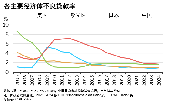 美国在次贷危机后较早实现资产质量修复,不良贷款率在2009年高点超过5%,随后快速回落,2013年已降至1%以下并保持稳定。这反映出美国银行体系在危机后的较短时间内完成了风险确认和资产调整,目前不良率波动主要受经济周期的短期扰动影响。