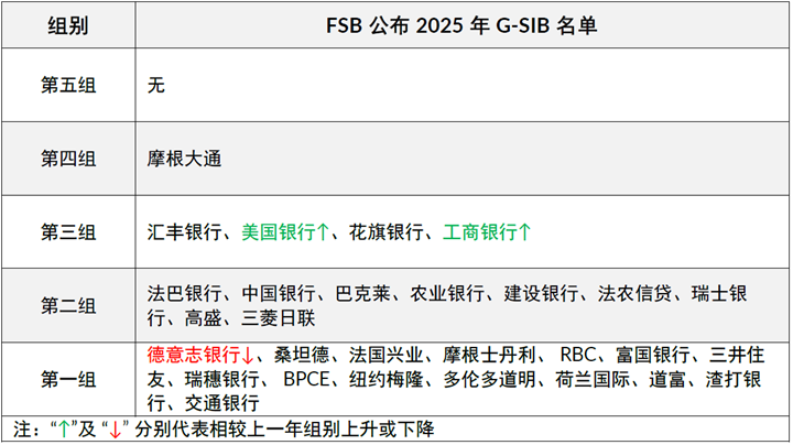 2025年11月27日,金融稳定理事会(FSB)公布本年全球系统重要性银行(G-SIB)名单,此次公布的名单中来自中国的商业银行数量为5家,与上一年保持一致。其中工商银行组别由上一年的第二组上升至本年的第三组,成为首家进入G-SIB第三组的中资机构。组别提升后,工商银行需要满足的附加资本要求将由此前的1.5%上升至2.0%。其余4家机构中,中国银行、农业银行、建设银行本年继续维持第二组别的位置,交通银行亦稳定于G-SIB第一组别。