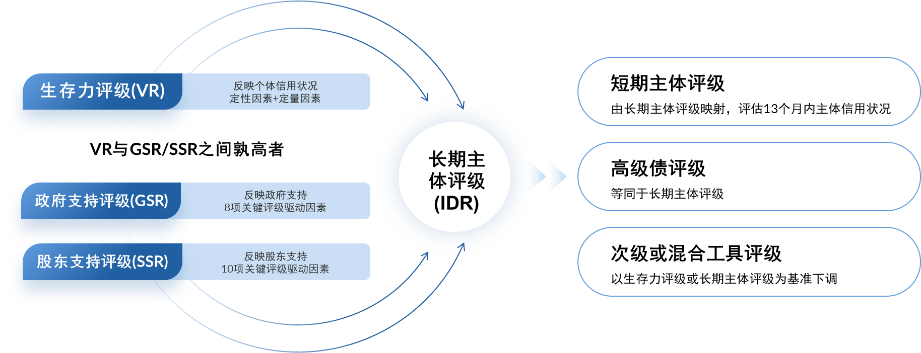 惠誉博华评定银行的长期主体评级兼顾了个体信用状况和潜在外部支持。银行的生存力评级(VR)反映了银行自身的信用水平;政府支持评级(GSR)或股东支持评级(SSR)反映了特定银行在需要时获得外部支持的力度和可能性。短期主体评级根据与长期主体评级的对应表来确定(详情请见“惠誉博华银行评级标准”)。