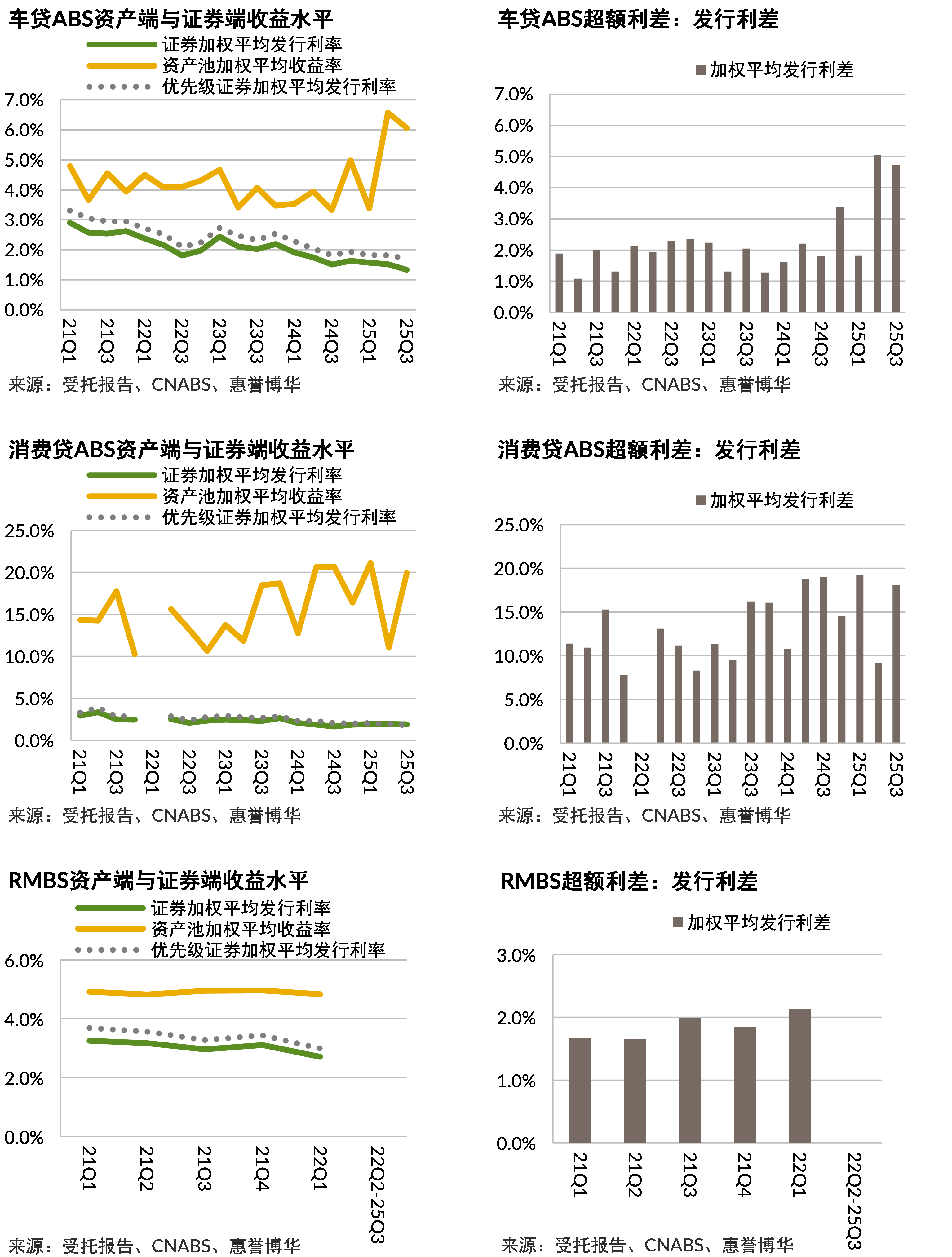 - 车贷ABS:2025年三季度共发行7单车贷ABS,资产池平均收益率为6.07%,较上季度下降0.51%,维持高位水平;证券发行利率下降19个基点,综合导致发行利差水平较上季度小幅下降0.32%。