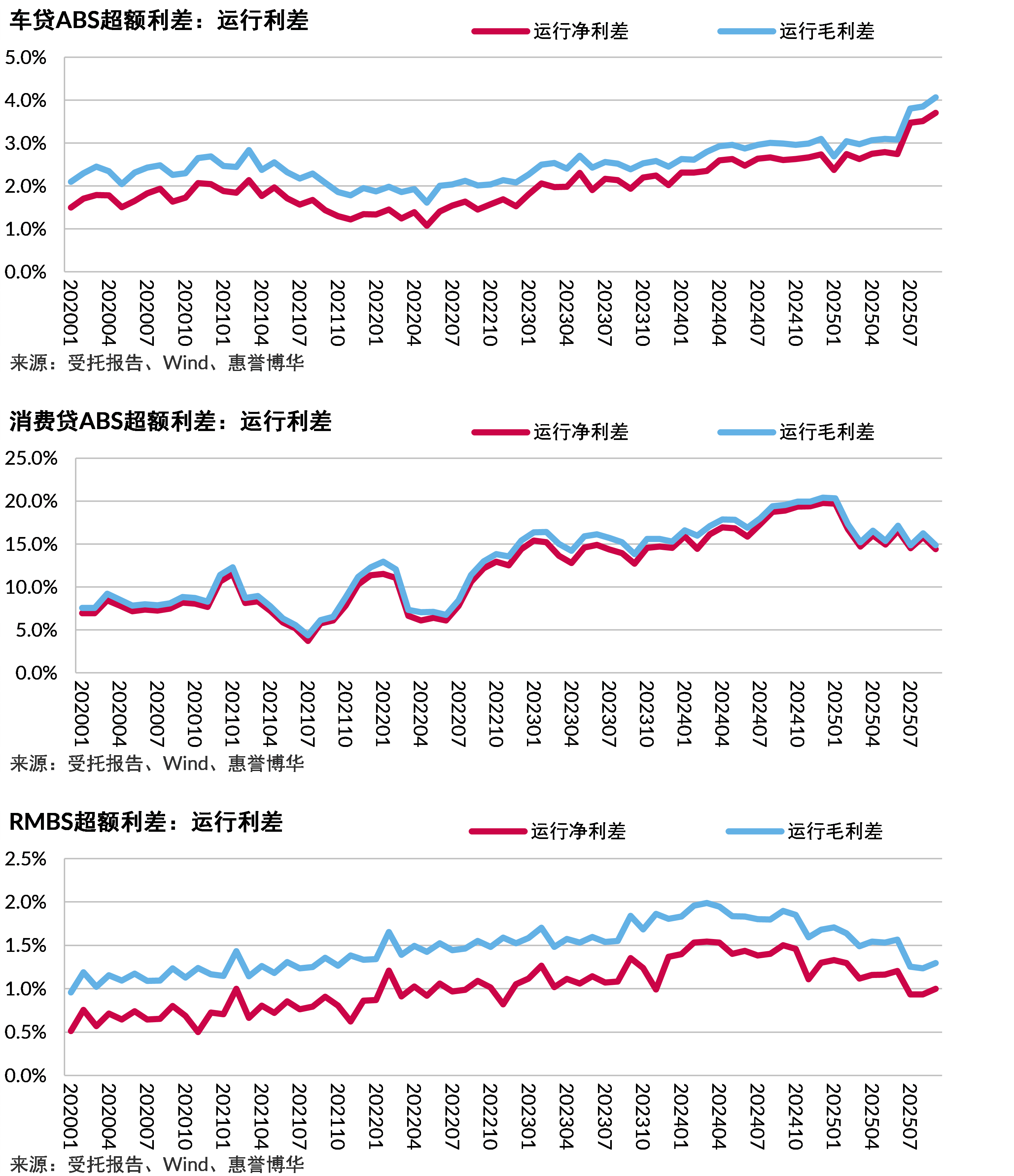 本季度末,车贷ABS、消费贷ABS及RMBS的运行毛利差分别为4.07%、14.84%和1.30%,运行净利差分别为3.71%、14.40%和1.00%,二者之间的差额反映了隐含交易成本。