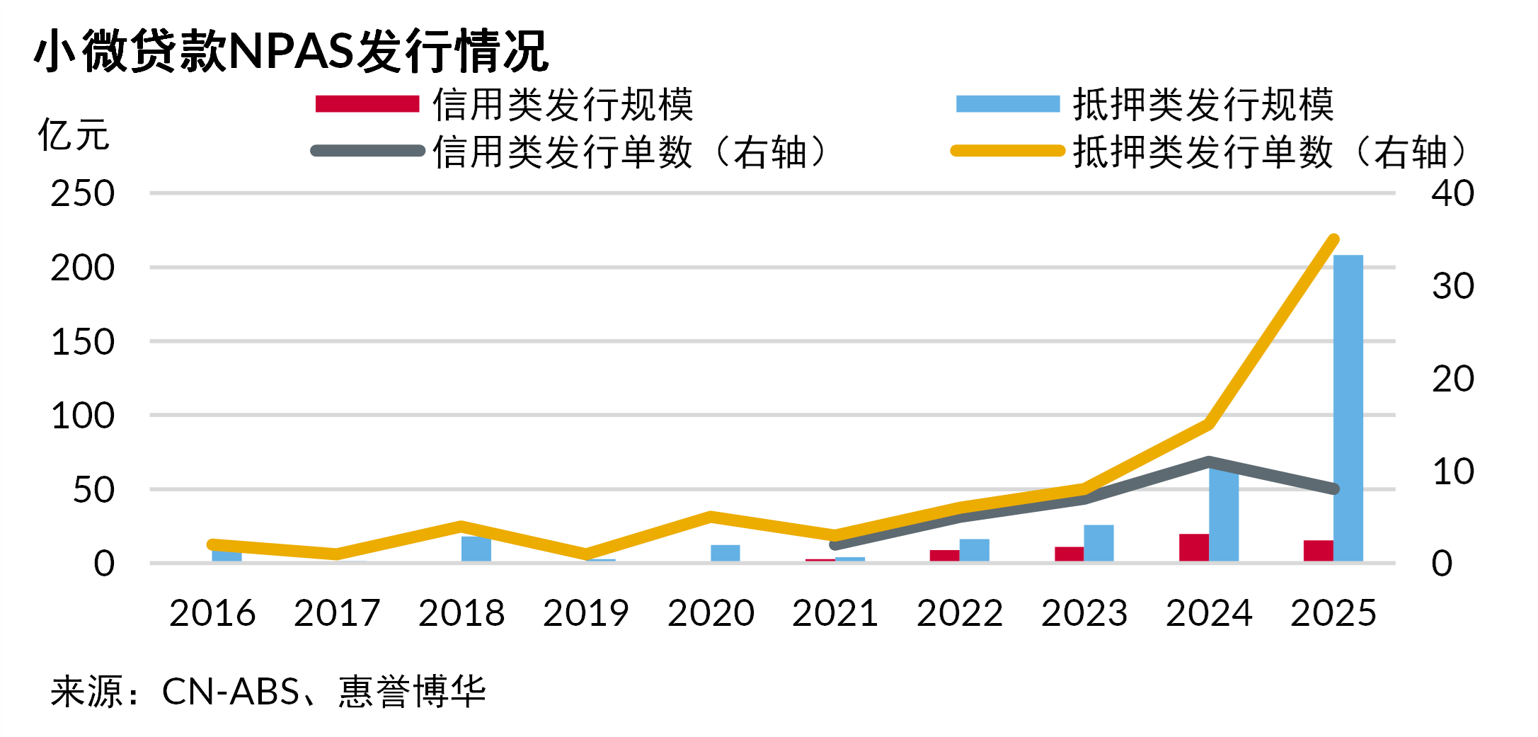 小微企业不良贷款快速累积,商业银行传统清收与核销模式承压,推动了不良资产证券化成为小微企业不良贷款的重要处置渠道。2016 年招商银行发行国内首单小微贷款NPAS,开创证券化处置小微企业不良贷款的先例。2016—2021 年市场整体处于起步阶段,发行规模与单数偏低。2022 年以来,伴随小微不良余额持续走高,小微贷款 NPAS 供给显著扩容,发行节奏与规模快速上行。2025 年银行间市场发行了43单小微贷款NPAS,较2024年增加17单,发行规模达223.3 亿元,发行规模是2024年的2.6倍。证券化成为银行缓释小微企业不良贷款压力、优化资产结构的核心创新工具,市场化处置效能持续提升。